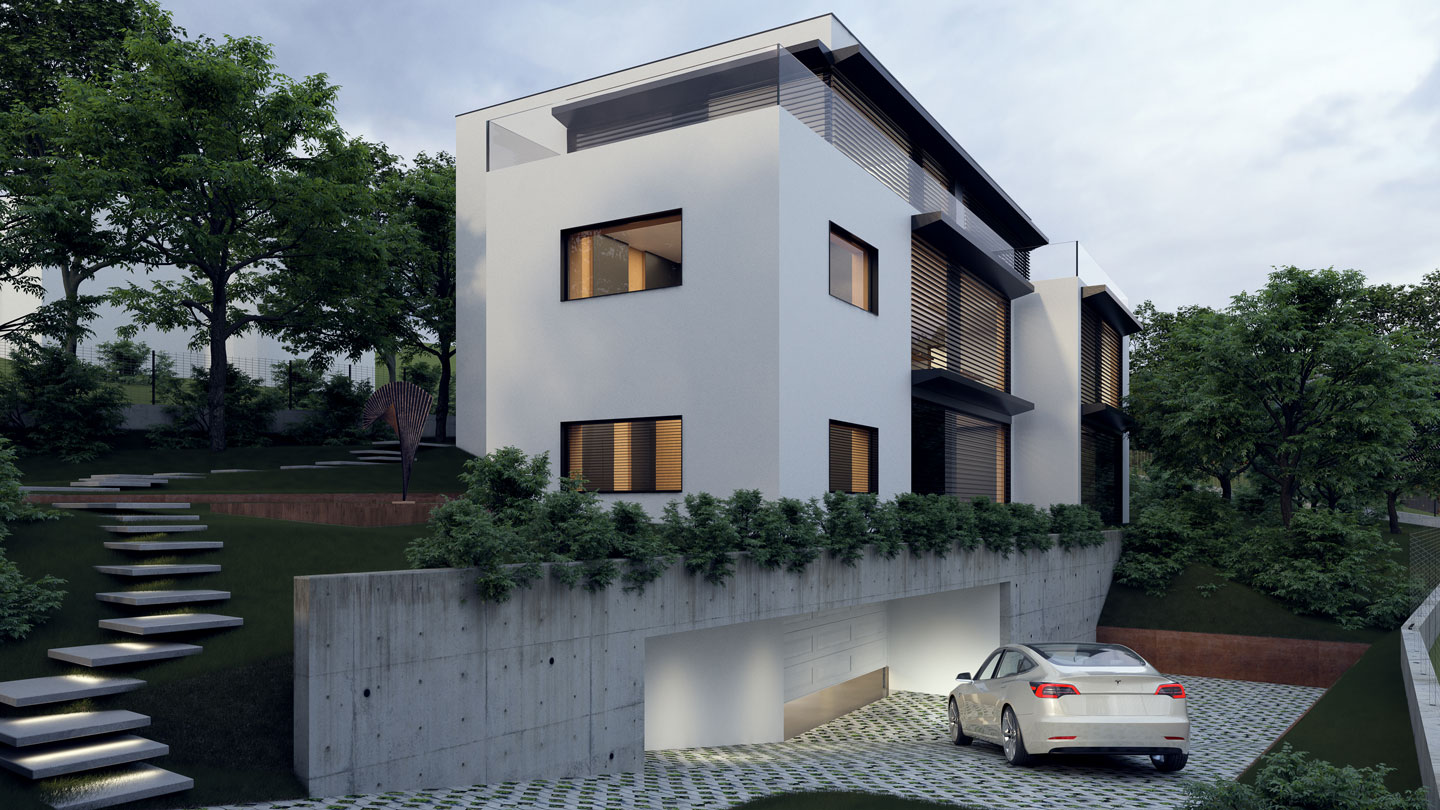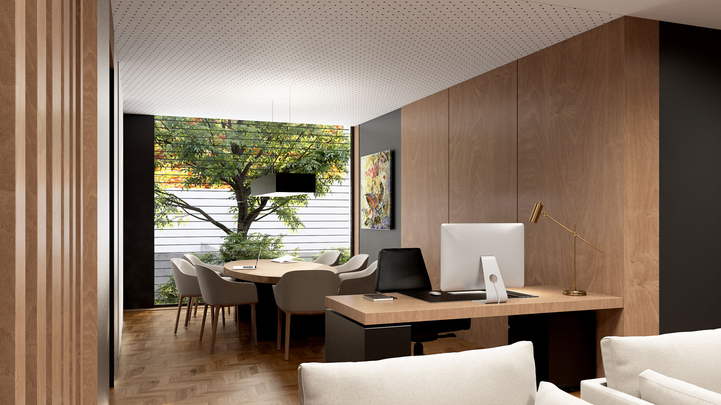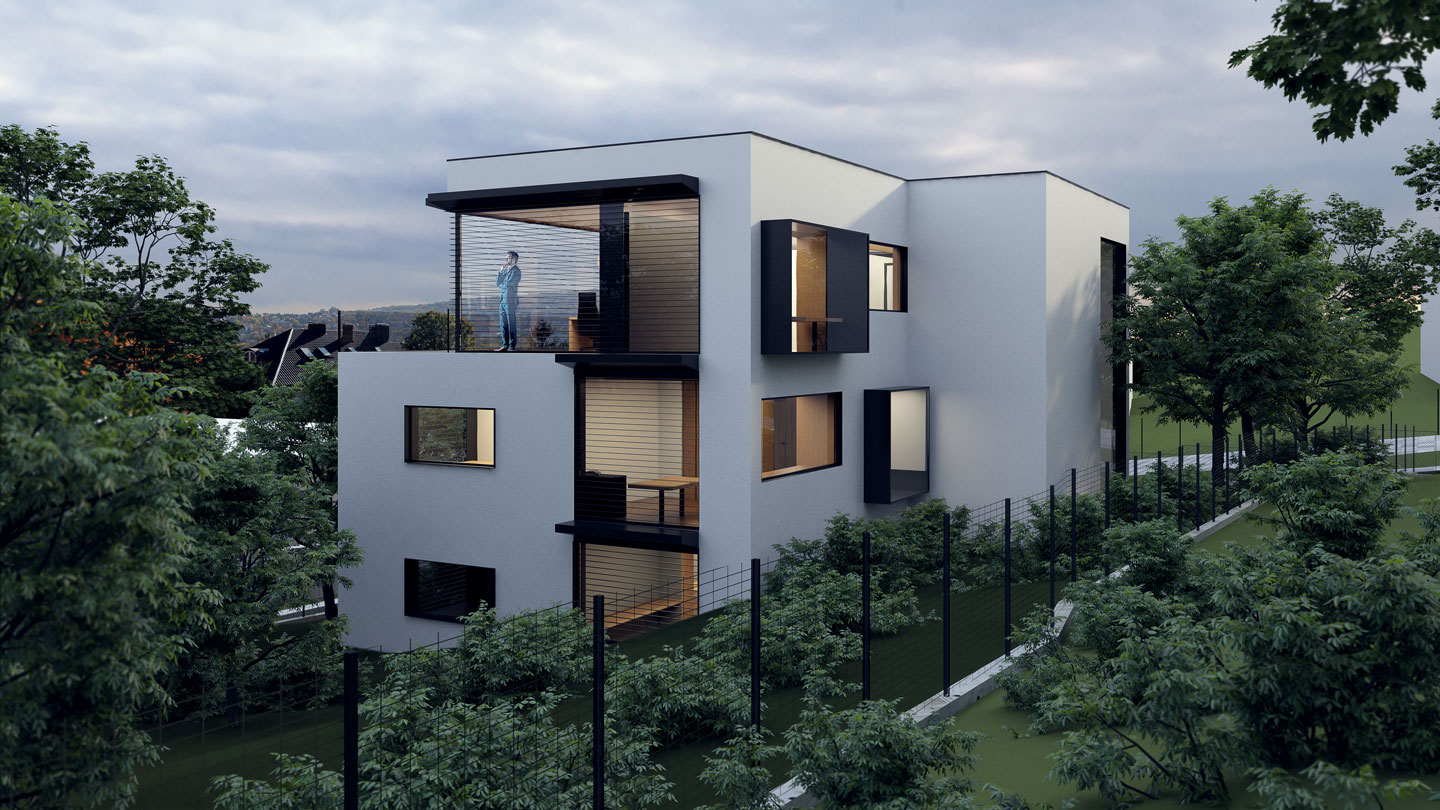 A tömegformálás gazdaságossága, a homlokzatfelületek egyszerű vakolt struktúrája a kerületre jellemző bauhaus időszakot idézi, melyet a gondosan zöldterületre és panorámára komponált ablakok tesznek maivá, izgalmassá. A kert értékes zöld fái képkompozíciót alkotva jelennek meg a prémium felületekkel ellátott irodafalakon ezáltal mindenhonnan érezhetővé téve a zöld környezet jelenlétét.