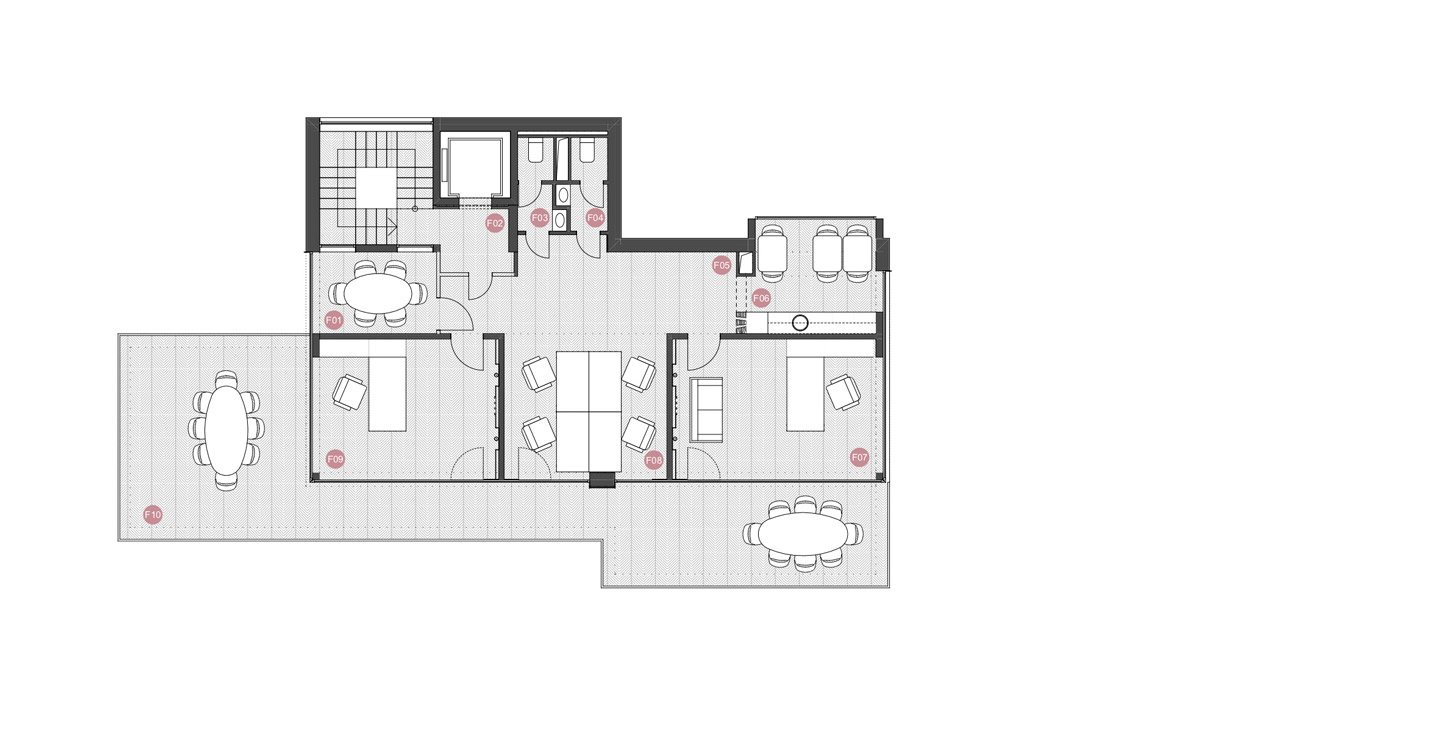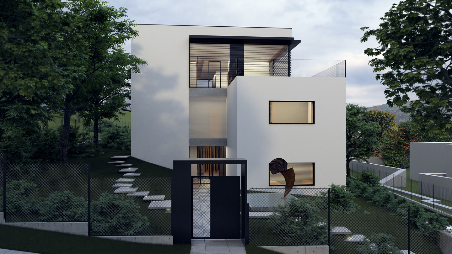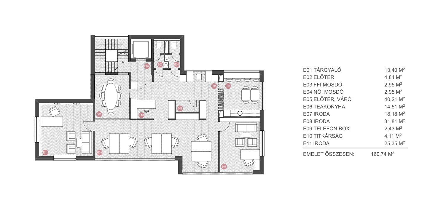 A tömegformálás gazdaságossága, a homlokzatfelületek egyszerű vakolt struktúrája a kerületre jellemző bauhaus időszakot idézi, melyet a gondosan zöldterületre és panorámára komponált ablakok tesznek maivá, izgalmassá. A kert értékes zöld fái képkompozíciót alkotva jelennek meg a prémium felületekkel ellátott irodafalakon ezáltal mindenhonnan érezhetővé téve a zöld környezet jelenlétét.