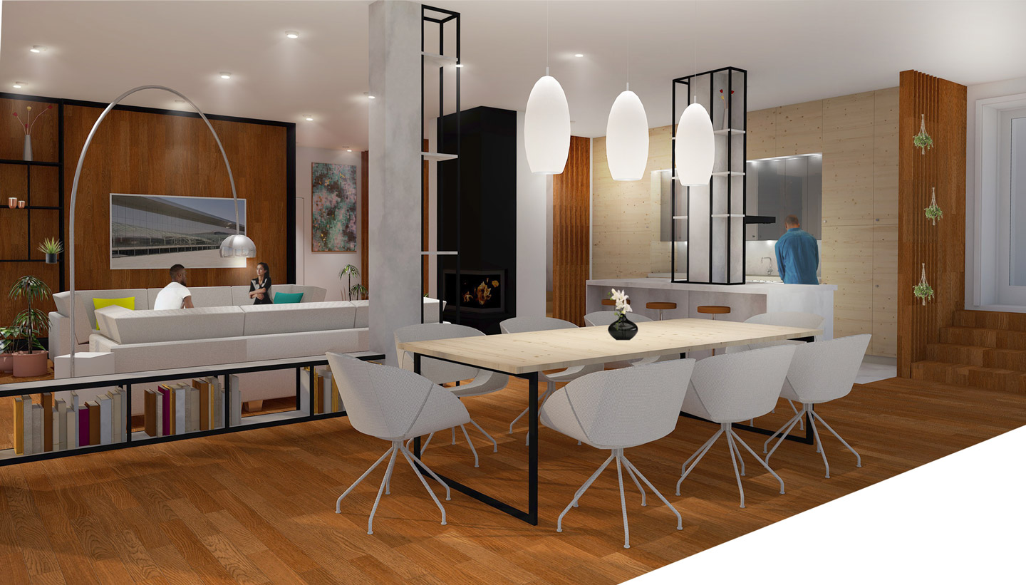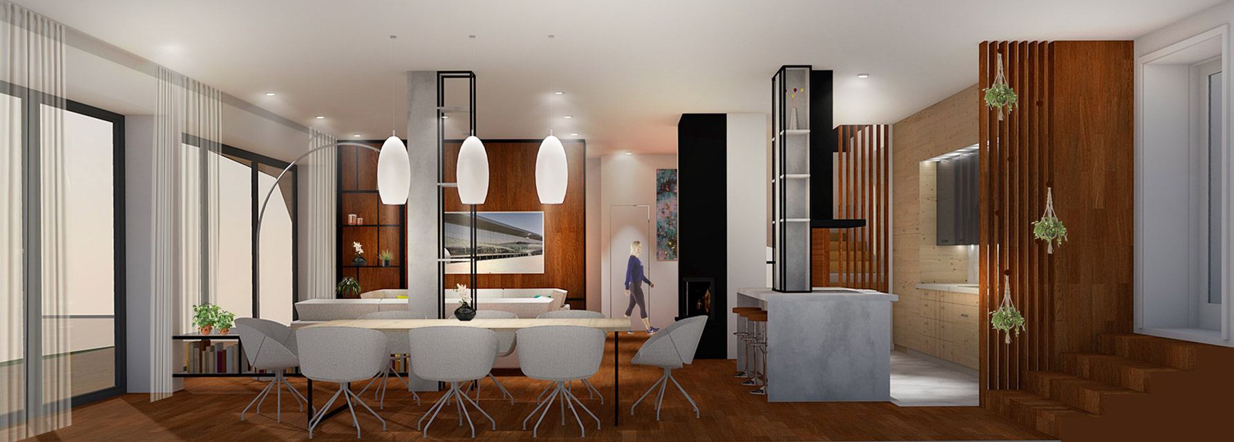 Földszint: előtér, vendég wc, gardrób, 68 m2-es nappali-étkező-konyha, dolgozószoba, szülői háló, fürdőszoba-gardrób